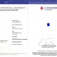 In the realm of luxury, where ambition and sophistication converge, stands a singular masterpiece: a 6.51-carat radiant blue sapphire, certified by the esteemed C.Dunaigre. This gem, offered by The Natural Sapphire Company, embodies the quintessence of elegance and refined opulence. At first sight, it captivates with its striking transparency and vivid color intensity, each facet telling a tale of unfathomable depths. Its radiant cut is an ode to precision and artistry, transforming light into an ethereal dance of brilliance and fire. Originating from the treasured mines of Ceylon, this sapphire's clarity, very slightly included and evaluated at eye level, speaks to the whisper of nature’s hand in its creation.