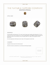 The Natural Sapphire Company presents an exquisite gemstone, notable for its substantial size and remarkable visual properties, ideally suited for those seeking to create an exceptional and unforgettable statement piece. This semi-translucent grey sapphire, weighing an impressive 7.25 carats, is expertly fashioned in a cushion shape, featuring dimensions of 13.23 x 10.78 x 3.41 mm. Its substantial size offers a commanding presence that ensures this gemstone stands out in any jewelry ensemble. Such dimensions not only enhance the stone's visual appeal but also provide an ideal canvas to showcase its inherent beauty and intense coloration.