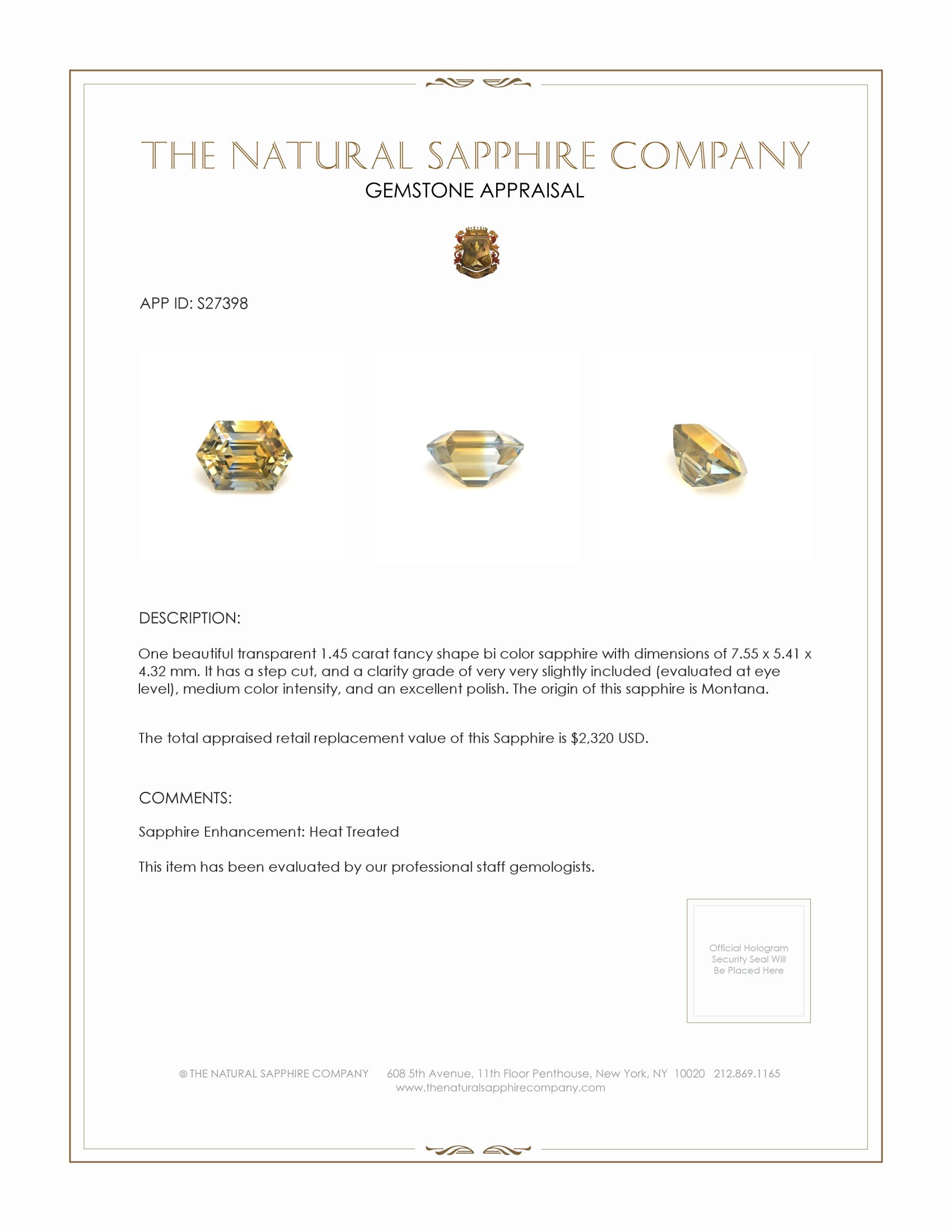 Introducing a gem of untold elegance and rarity, the exquisite 1.45 carat fancy shape sapphire from The Natural Sapphire Company, a treasure rooted in the enchanting landscapes of Montana. This bi-color sapphire resonates with an ethereal beauty that captivates and compels, set apart by its unique interplay of hues and shapes. With measurements of 7.55 x 5.41 x 4.32 mm, this remarkable stone reflects our commitment to superior quality and exceptional craftsmanship.