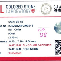 In the heart of ancient Ceylon now known as Sri Lanka lies a storied land renowned for its breathtaking gemstones Among these treasures is a remarkable 2.40 carat bi color sapphire Masterfully crafted with an oval shape and dimensions measuring 8.81 by 7.10 by 4.65 millimeters this gem captures the imagination of discerning collectors An attribute of supreme importance the sapphire boasts a mixed brilliant cut that enhances its ability to refract light flooding its internal facets with shimmering brilliance Each facet has been precision cut to exact standards that reveal the gem’s innate beauty while offering the high clarity grade of very slightly included Evaluated at eye level this means that only a minimal number of internal features are visible maintaining the gem's peaceful interior landscape