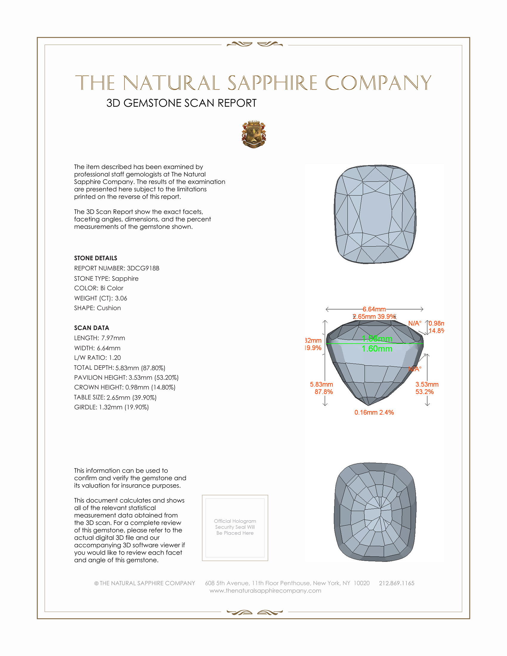 Indulge in the allure of a truly exceptional gemstone that stands as a testament to nature's unparalleled artistry. Presenting an exquisite transparent 3.06 carat cushion shape bi color sapphire, meticulously crafted to captivate even the most discerning collectors. Boasting dimensions of 7.97 x 6.64 x 5.83 mm, this mesmerizing gem combines a mixed brilliant cut with intense color intensity, resulting in a kaleidoscope of radiant hues that dance with the light. Originating from the fabled lands of Ceylon, now known as Sri Lanka, this sapphire offers a glimpse into the ancient geology of this remarkable island, celebrated for producing some of the finest gems in history.