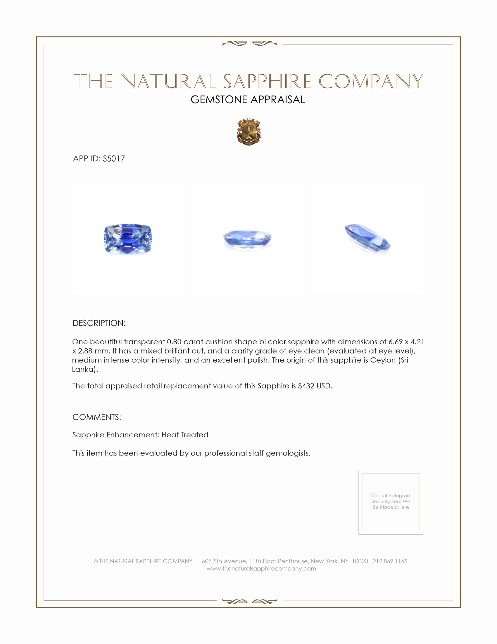 The ring features a beautiful, transparent 0.80 carat cushion shape bi color sapphire with the dimensions of 6.69 x 4.21 x 2.88 mm and a mixed brilliant cut. It has a clarity grade of eye clean (evaluated at eye level), medium intense color saturation, and an excellent polish. The origin of this sapphire is Ceylon (Sri Lanka).