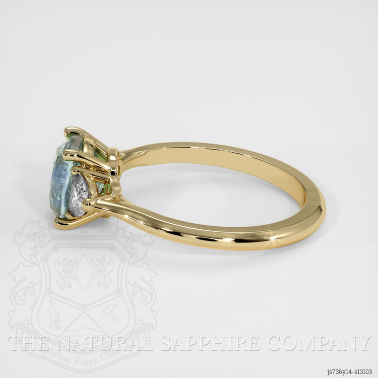 The ring features a beautiful, transparent 1.84 carat cushion shape bi color sapphire with the dimensions of 7.20 x 6.04 x 4.63 mm and a mixed brilliant cut. It has a clarity grade of slightly included (evaluated at eye level), medium color saturation, and an excellent polish. The origin of this sapphire is Ceylon (Sri Lanka).