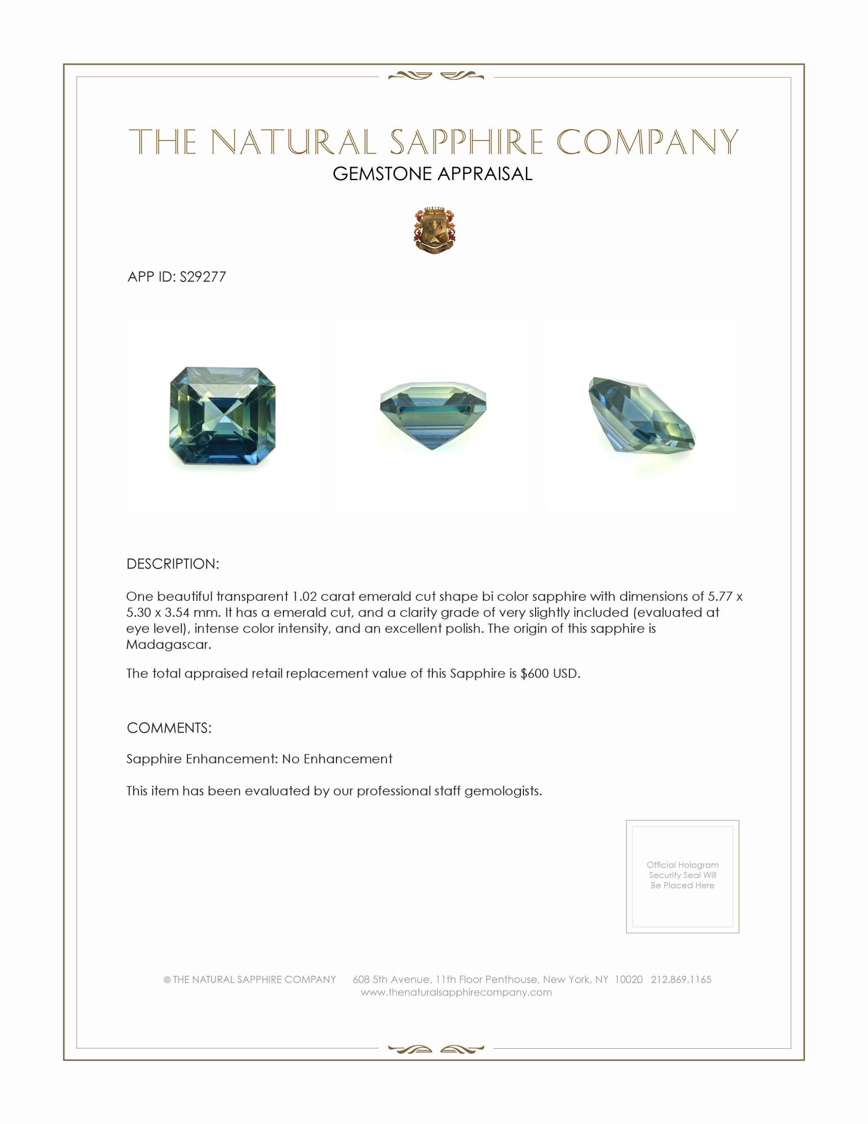 Discover a rare statement of refined taste with this exceptional 1.02 carat, emerald cut, bi color sapphire ring offered by The Natural Sapphire Company. The transparent, emerald cut sapphire measures 5.77 x 5.30 x 3.54 mm, and it displays intense color saturation with a subtle, natural shift that makes each angle unique. Evaluated at eye level, the stone carries a clarity grade of very slightly included, it is free of enhancement, and it has an excellent polish that maximizes brilliance. Set in a finely crafted 14K yellow gold mounting, this gem rests in a design that celebrates symmetry and light, creating an heirloom feeling that is both modern and timeless.