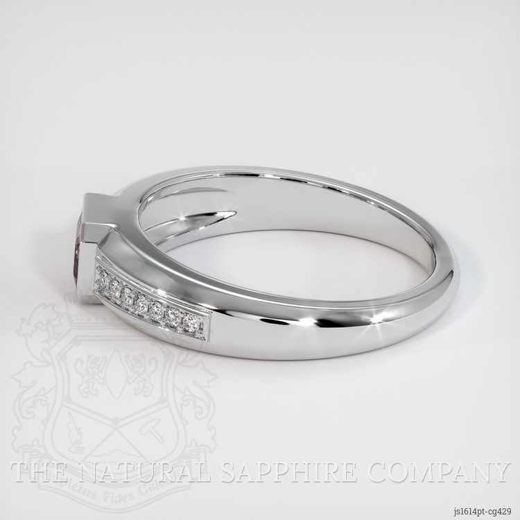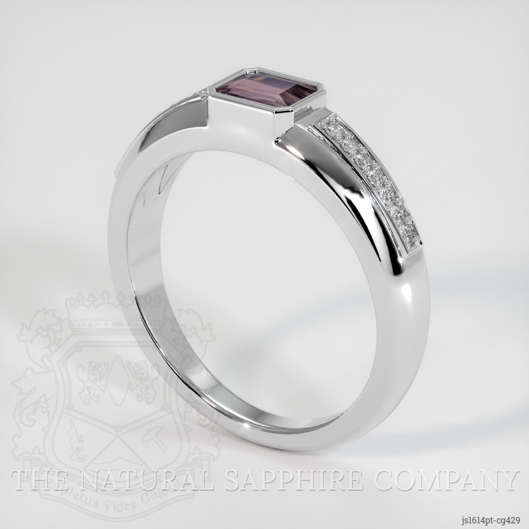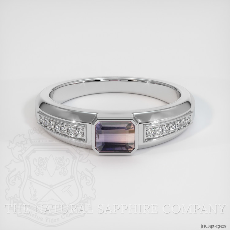 The men's ring features a beautiful, transparent 1.27 carat emerald cut shape bi color sapphire with the dimensions of 6.46 x 5.14 x 3.19 mm and a emerald cut. It has a clarity grade of very slightly included (evaluated at eye level), medium intense color saturation, and an excellent polish. The origin of this sapphire is Ceylon (Sri Lanka).