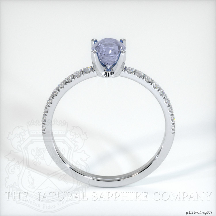 The ring features a beautiful, transparent 1.26 carat oval shape bi color sapphire with the dimensions of 6.43 x 5.74 x 4.37 mm and a mixed brilliant cut. It has a clarity grade of very slightly included (evaluated at eye level), medium color saturation, and an excellent polish. The origin of this sapphire is Montana.