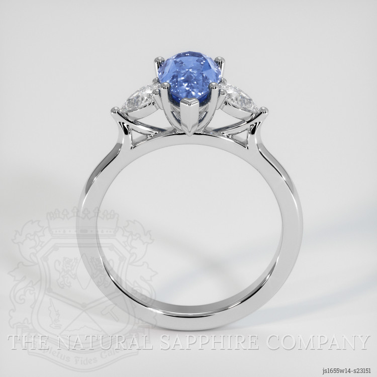 The ring's elegant design is further enriched by its flawless setting in lustrous 14K white gold, known for its timeless appeal and strength. Complementing the central sapphire, two dazzling pear-shaped natural diamonds frame the gem, weighing approximately 0.30 carats in total. These diamonds boast a clarity grade of VS1 to VS2, revealing only the slightest inclusions under magnification while maintaining a remarkable E color grade. This harmonious combination of stones symbolizes both tradition and sophistication, reflecting the values of those who cherish enduring beauty.