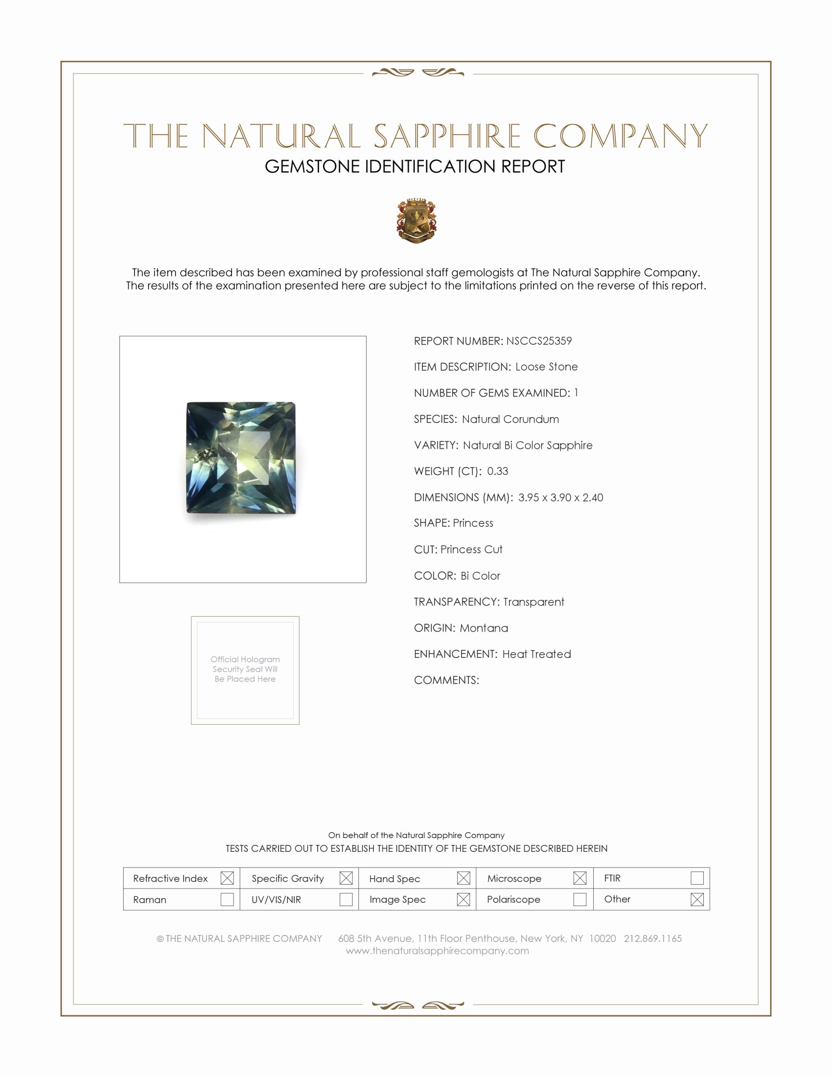 Introducing our exceptional men's ring featuring a stunning 0.33 carat bi-color sapphire, set in premium 14K white gold. At The Natural Sapphire Company, we understand the importance of choosing a piece that not only captivates with its beauty but also withstands the test of time. This gemstone, with its precise princess cut measuring 3.95 x 3.90 x 2.40 mm, offers a unique blend of intense color saturation and transparency, a rarity that sets it apart from other sapphires on the market. Originating from Montana, its authenticity is reflected in the harmony of its bi-color hues, making it a distinctive choice for those seeking something beyond the ordinary.