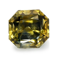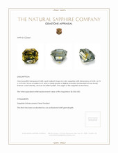 The ring features a beautiful, transparent 0.88 carat radiant shape bi color sapphire with the dimensions of 5.00 x 4.74 x 4.10 mm and a radiant cut. It has a clarity grade of slightly included (evaluated at eye level), intense color saturation, and an excellent polish. The origin of this sapphire is Montana.
