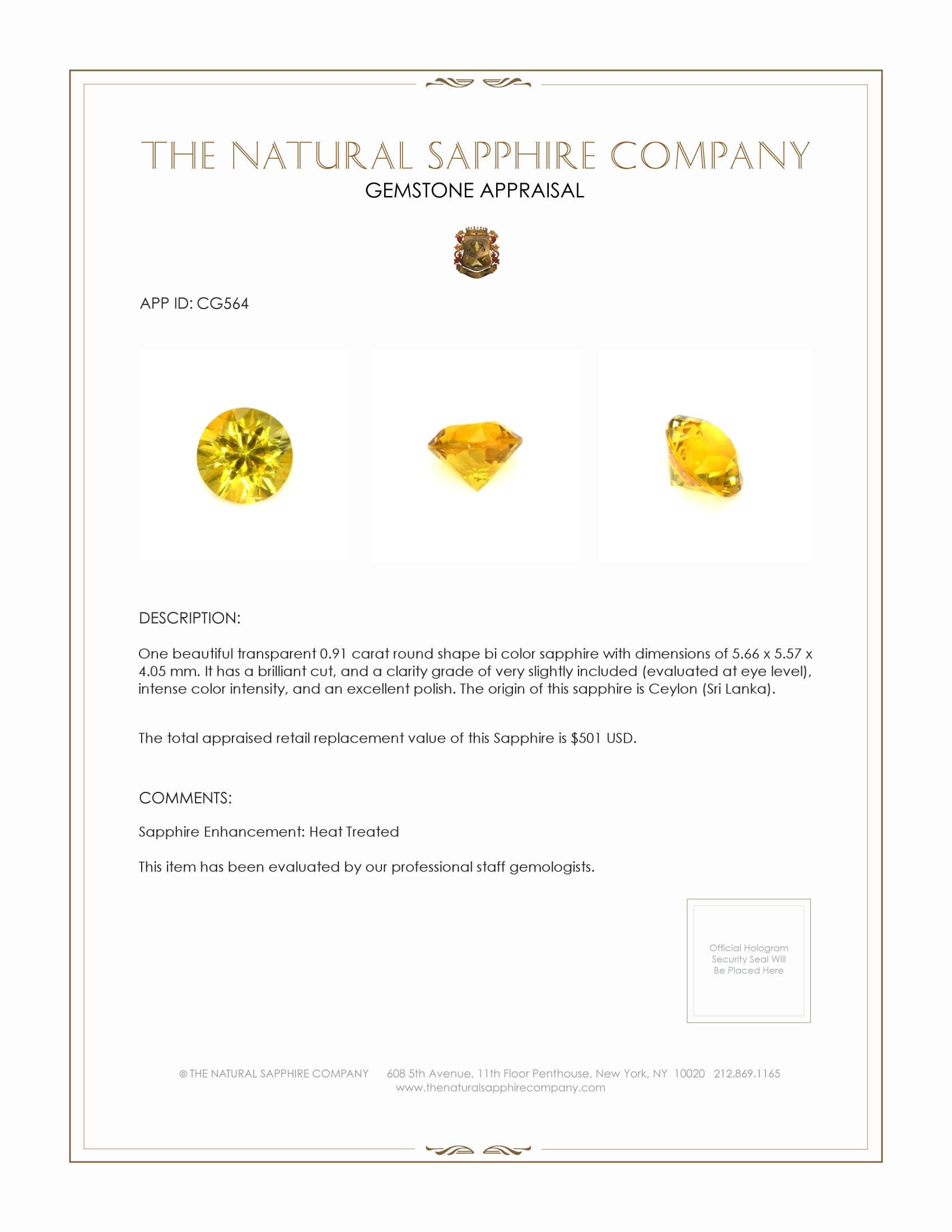 The ring features a beautiful, transparent 0.91 carat round shape bi color sapphire with the dimensions of 5.66 x 5.57 x 4.05 mm and a brilliant cut. It has a clarity grade of very slightly included (evaluated at eye level), intense color saturation, and an excellent polish. The origin of this sapphire is Ceylon (Sri Lanka).