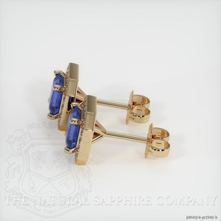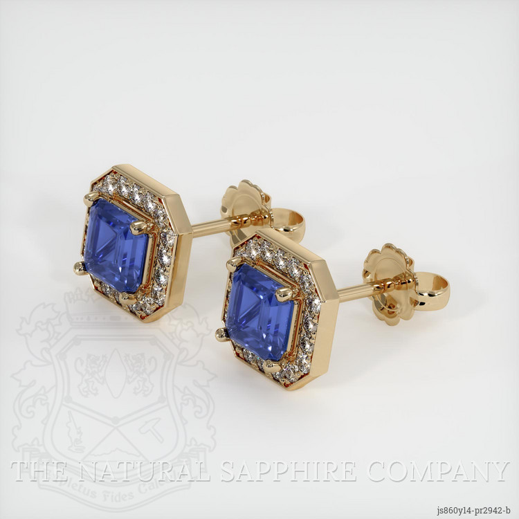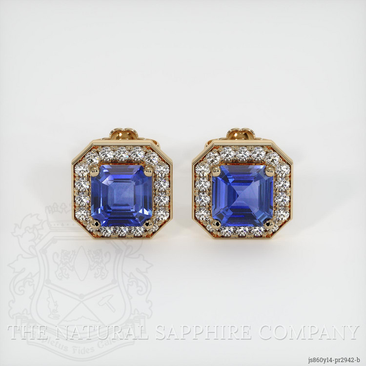 The earrings feature a beautiful, transparent pair of sapphires that are 2.00 total carat weight. They are asscher - octagon shape blue sapphires, with the dimensions of 5.99 x 5.98 x 3.08 mm and are asscher cut, have a clarity grade of eye clean (evaluated at eye level), intense color saturation, and an excellent polish. The origin of this pair of sapphires is Ceylon (Sri Lanka).