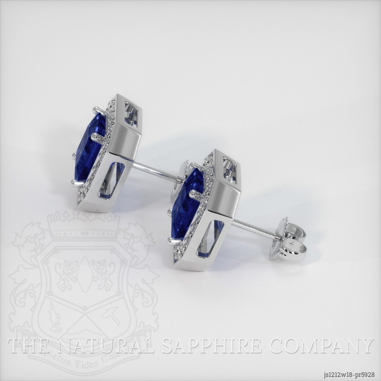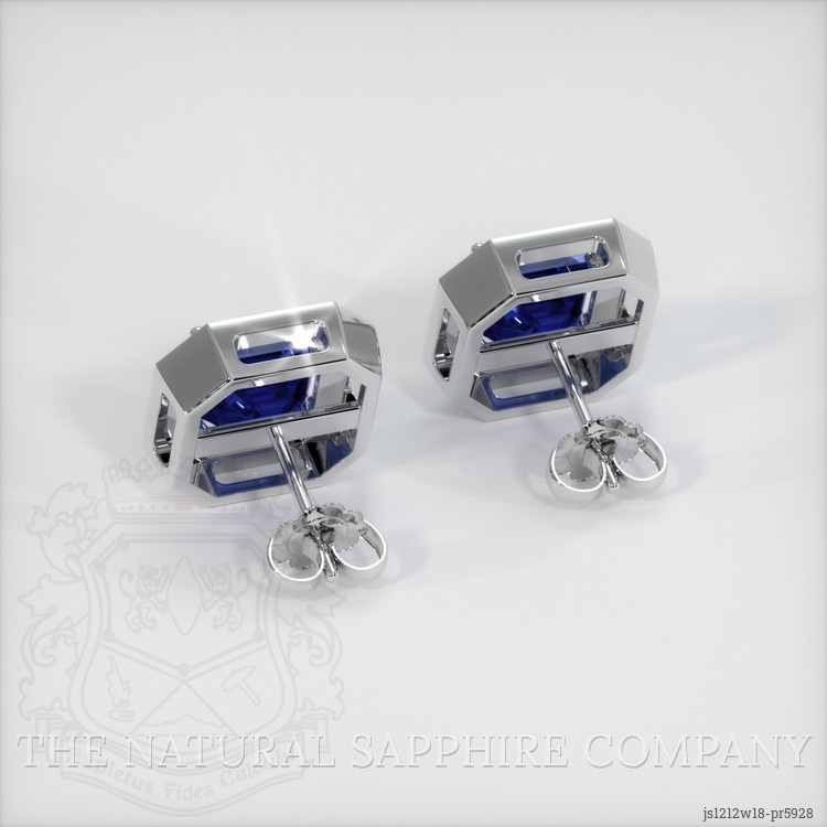 The earrings feature a beautiful, transparent pair of sapphires that are 2.47 total carat weight. They are asscher - octagon shape blue sapphires, with the dimensions of 6.14 x 6.06 x 3.78 mm and are asscher cut, have a clarity grade of very slightly included (evaluated at eye level), intense color saturation, and an excellent polish. The origin of this pair of sapphires is Ceylon (Sri Lanka).