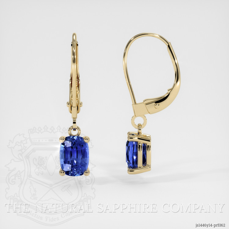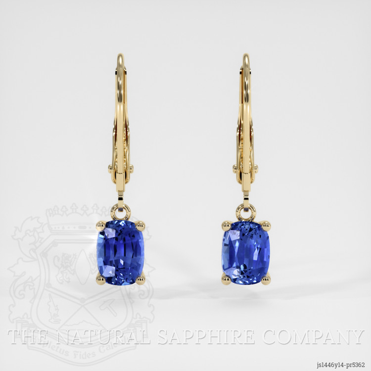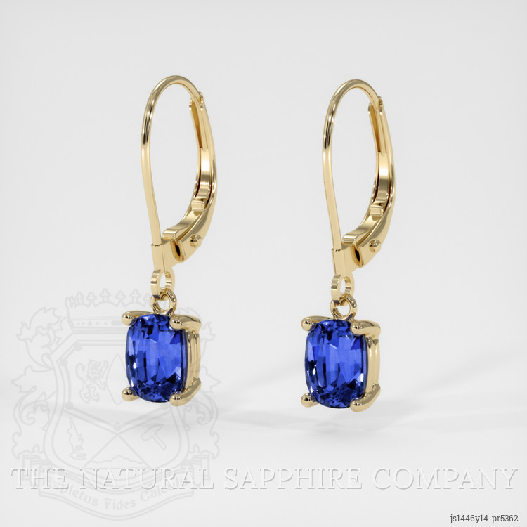 The earrings feature a beautiful, transparent pair of sapphires that are 1.02 total carat weight. They are cushion shape blue sapphires, with the dimensions of 5.11 x 3.73 x 3.02 mm and are mixed brilliant cut, have a clarity grade of very slightly included (evaluated at eye level), intense color saturation, and an excellent polish. The origin of this pair of sapphires is Ceylon (Sri Lanka).