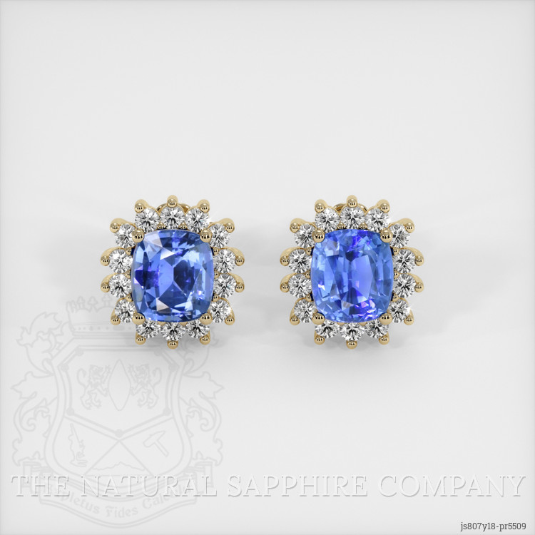 The earrings feature a beautiful, transparent pair of sapphires that are 1.79 total carat weight. They are cushion shape blue sapphires, with the dimensions of 5.66 x 5.00 x 3.57 mm and are mixed brilliant cut, have a clarity grade of very slightly included (evaluated at eye level), intense color saturation, and an excellent polish. The origin of this pair of sapphires is Ceylon (Sri Lanka).