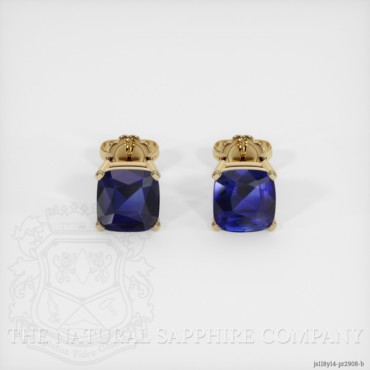 The earrings feature a beautiful, transparent pair of sapphires that are 1.90 total carat weight. They are cushion shape blue sapphires, with the dimensions of 6.04 x 6.02 x 3.19 mm and are mixed brilliant cut, have a clarity grade of eye clean (evaluated at eye level), vivid color saturation, and an excellent polish. The origin of this pair of sapphires is Madagascar.