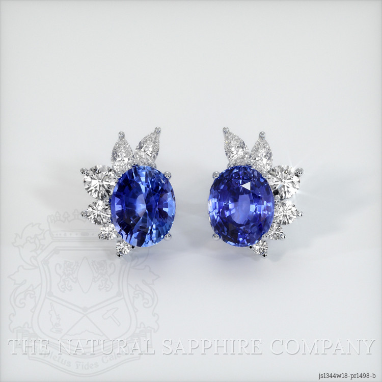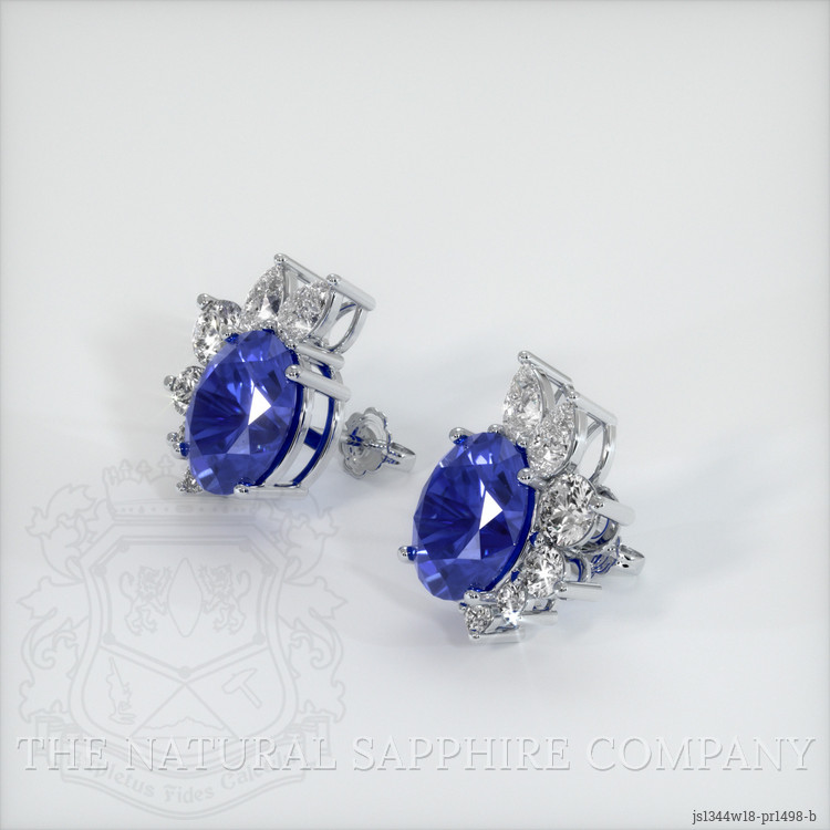 The earrings feature a beautiful, transparent pair of sapphires that are 8.74 total carat weight. They are oval shape blue sapphires, with the dimensions of 10.60 x 8.70 x 5.92 mm and are modified brilliant cut, have a clarity grade of very slightly included (evaluated at eye level), vivid color saturation, and an excellent polish. The origin of this pair of sapphires is Ceylon(Sri Lanka).