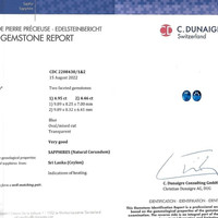 The earrings feature a beautiful, transparent C.Dunaigre certified pair of sapphires that are 9.41 total carat weight. They are oval shape blue sapphires, with the dimensions of 9.91 x 8.26 x 7.00 mm and are mixed brilliant cut, have a clarity grade of very slightly included (evaluated at eye level), vivid color saturation, and an excellent polish. The origin of this pair of sapphires is Ceylon (Sri Lanka).