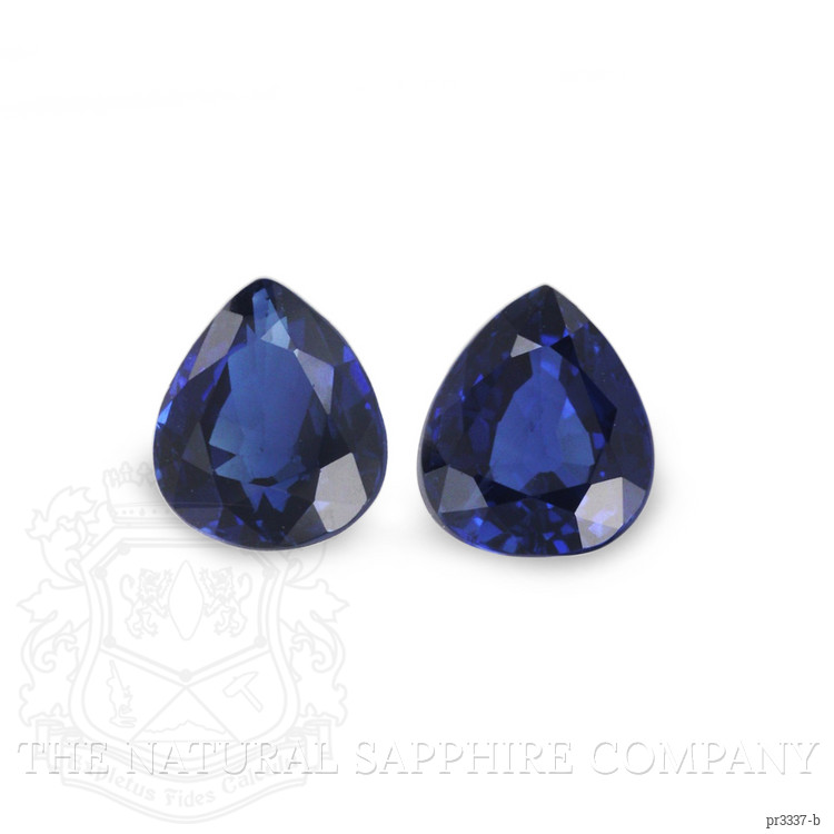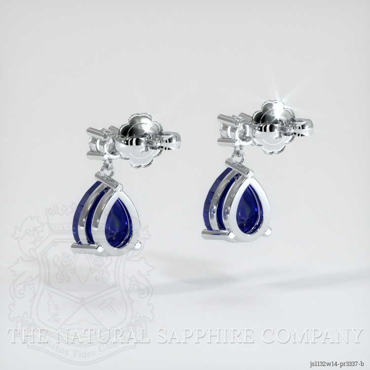 The earrings feature a beautiful, transparent pair of sapphires that are 1.94 total carat weight. They are pear shape blue sapphires, with the dimensions of 6.34 x 5.36 x 3.48 mm and are mixed brilliant cut, have a clarity grade of eye clean (evaluated at eye level), vivid color saturation, and an excellent polish. The origin of this pair of sapphires is Ceylon (Sri Lanka).