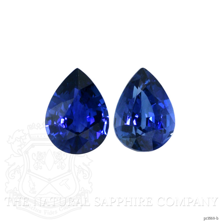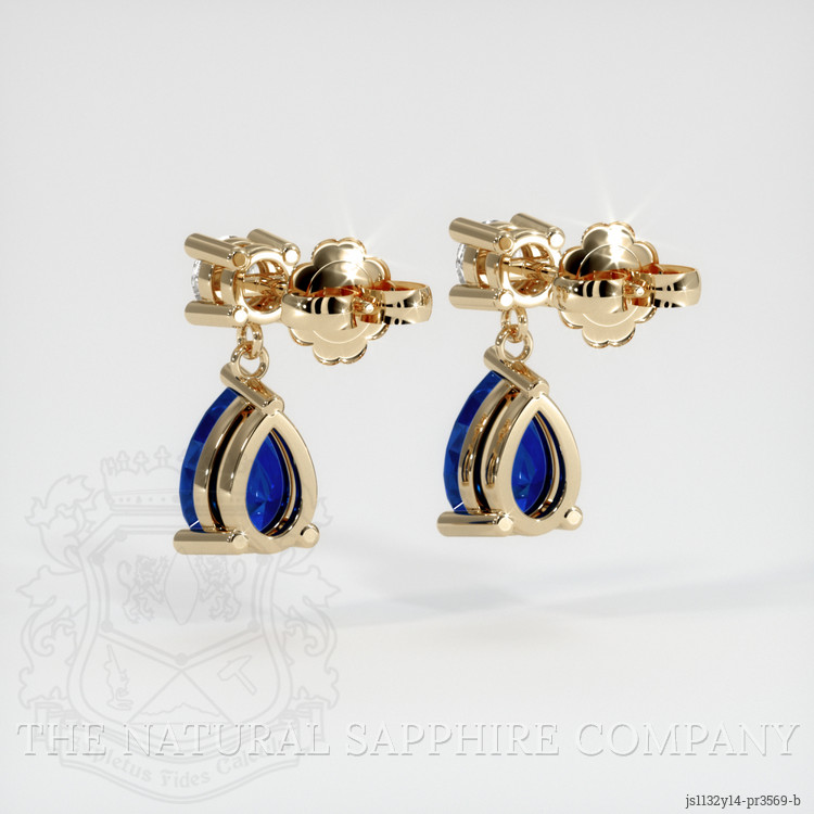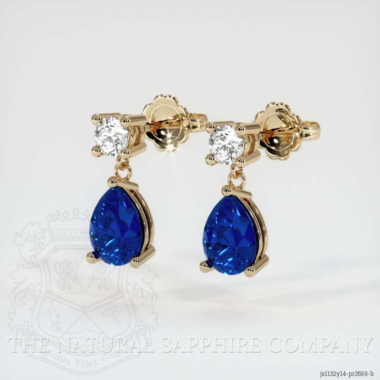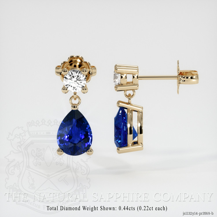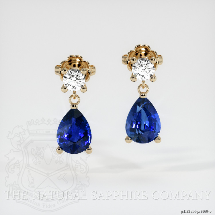 The earrings feature a beautiful, transparent pair of sapphires that are 2.54 total carat weight. They are pear shape blue sapphires, with the dimensions of 7.94 x 5.91 x 4.27 mm and are mixed brilliant cut, have a clarity grade of very slightly included (evaluated at eye level), vivid color saturation, and an excellent polish. The origin of this pair of sapphires is Ceylon (Sri Lanka).
