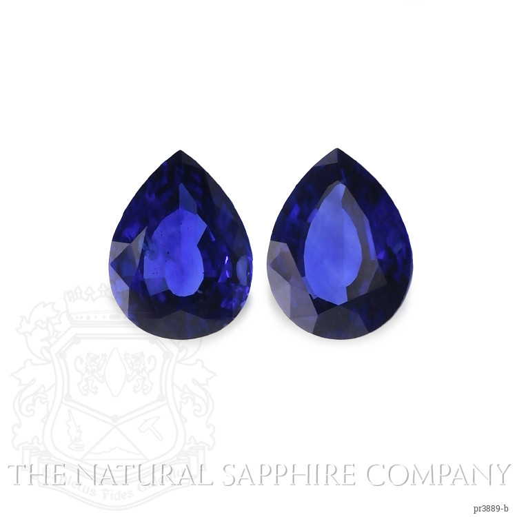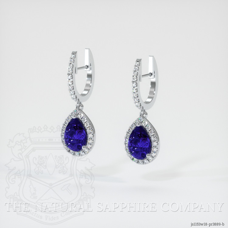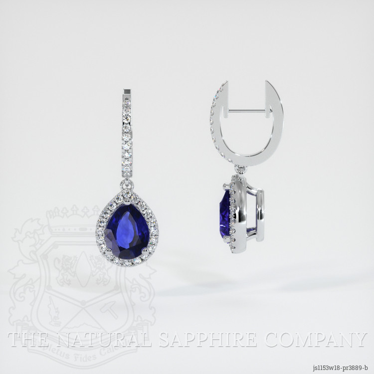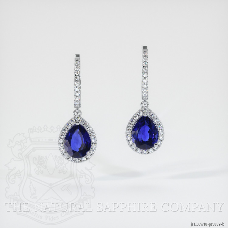 The earrings feature a beautiful, transparent pair of sapphires that are 3.82 total carat weight. They are pear shape blue sapphires, with the dimensions of 9.14 x 6.77 x 4.40 mm and are mixed brilliant cut, have a clarity grade of eye clean (evaluated at eye level), vivid color saturation, and an excellent polish. The origin of this pair of sapphires is Ceylon (Sri Lanka).