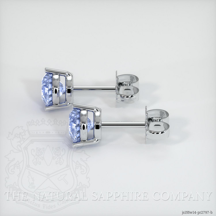 The earrings feature a beautiful, transparent pair of sapphires that are 0.69 total carat weight. They are round shape blue sapphires, with the dimensions of 4.15 x 4.15 x 2.71 mm and are brilliant cut, have a clarity grade of very slightly included (evaluated at eye level), light color saturation, and an excellent polish. The origin of this pair of sapphires is Ceylon (Sri Lanka).