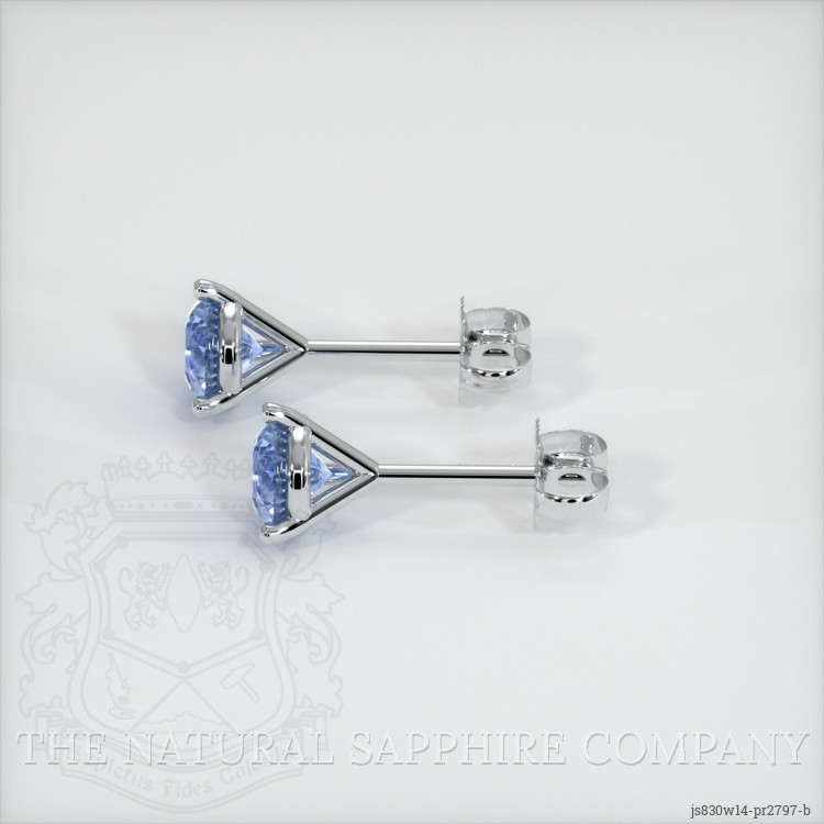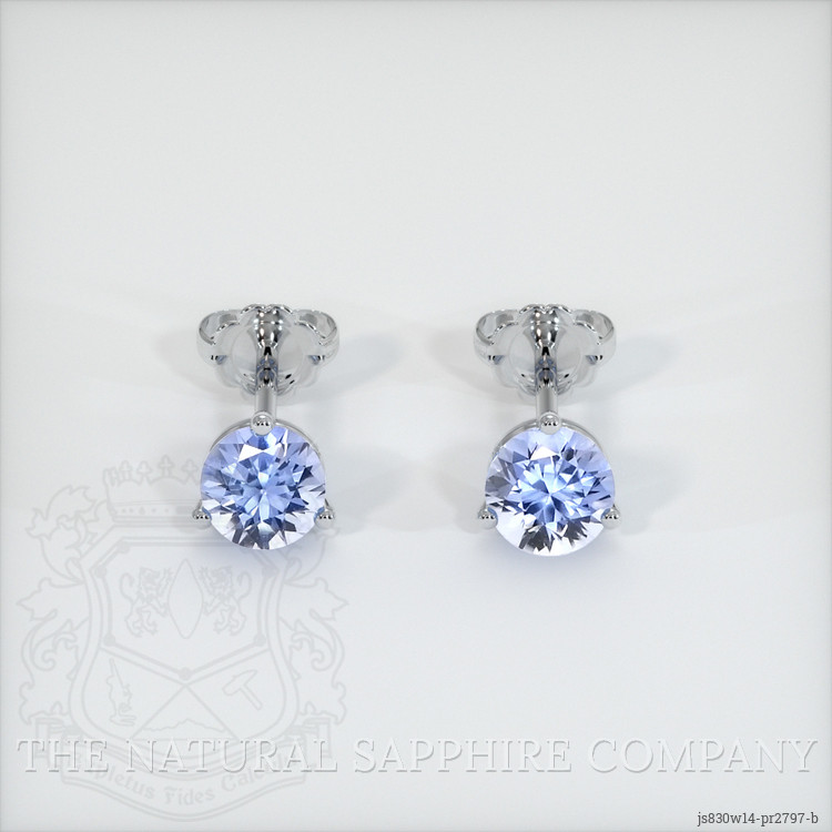 The earrings feature a beautiful, transparent pair of sapphires that are 0.69 total carat weight. They are round shape blue sapphires, with the dimensions of 4.15 x 4.15 x 2.71 mm and are brilliant cut, have a clarity grade of very slightly included (evaluated at eye level), light color saturation, and an excellent polish. The origin of this pair of sapphires is Ceylon (Sri Lanka).