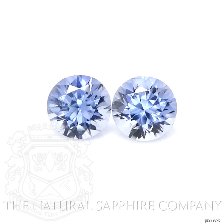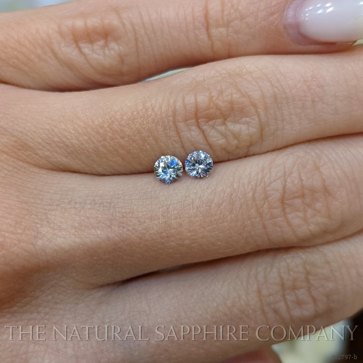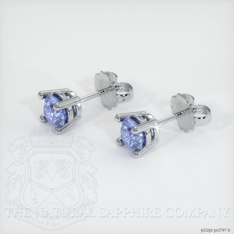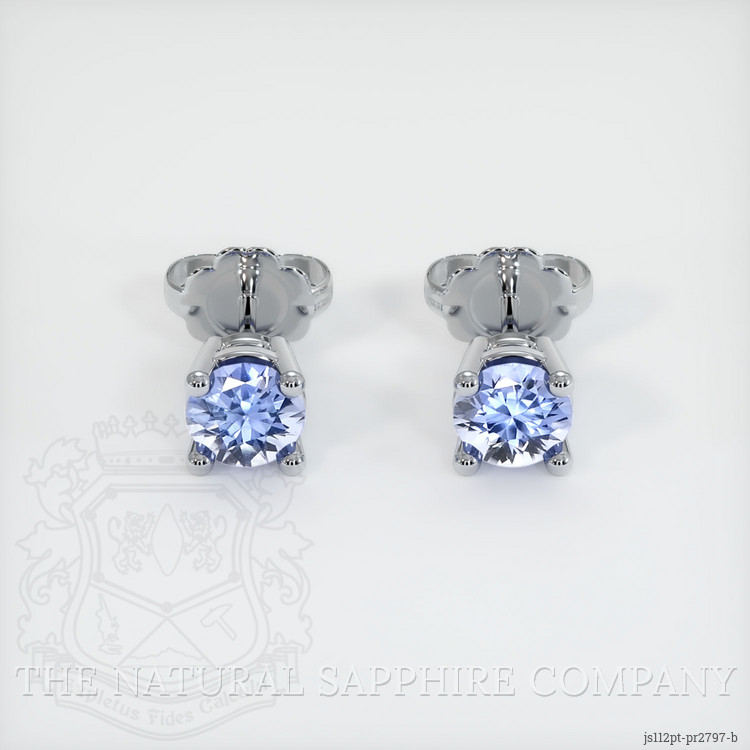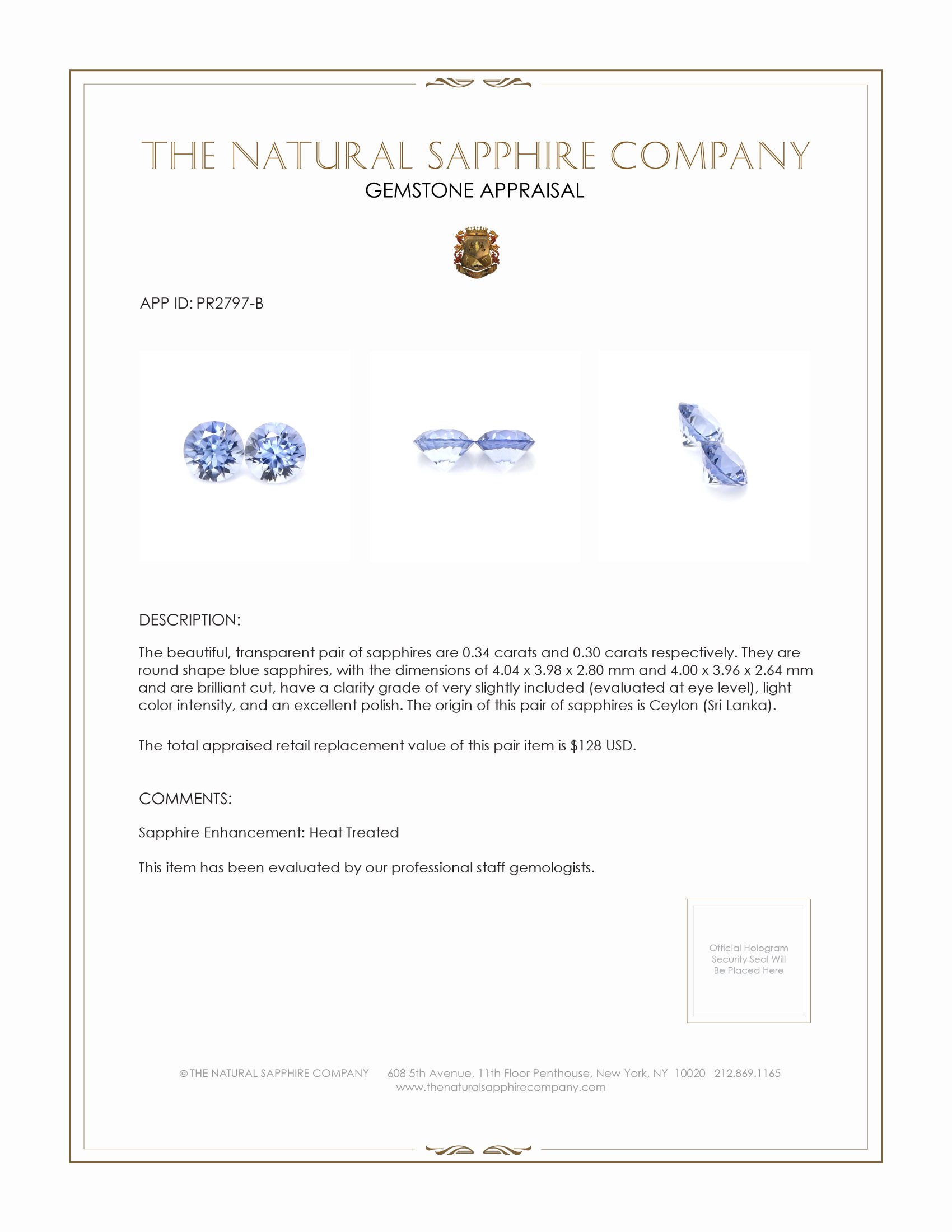 The earrings feature a beautiful, transparent pair of sapphires that are 0.69 total carat weight. They are round shape blue sapphires, with the dimensions of 4.15 x 4.15 x 2.71 mm and are brilliant cut, have a clarity grade of very slightly included (evaluated at eye level), light color saturation, and an excellent polish. The origin of this pair of sapphires is Ceylon (Sri Lanka).