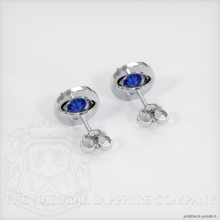 The earrings feature a beautiful, transparent pair of sapphires that are 0.79 total carat weight. They are round shape blue sapphires, with the dimensions of 4.23 x 4.20 x 3.00 mm and are mixed brilliant cut, have a clarity grade of eye clean (evaluated at eye level), vivid color saturation, and an excellent polish. The origin of this pair of sapphires is Thailand.