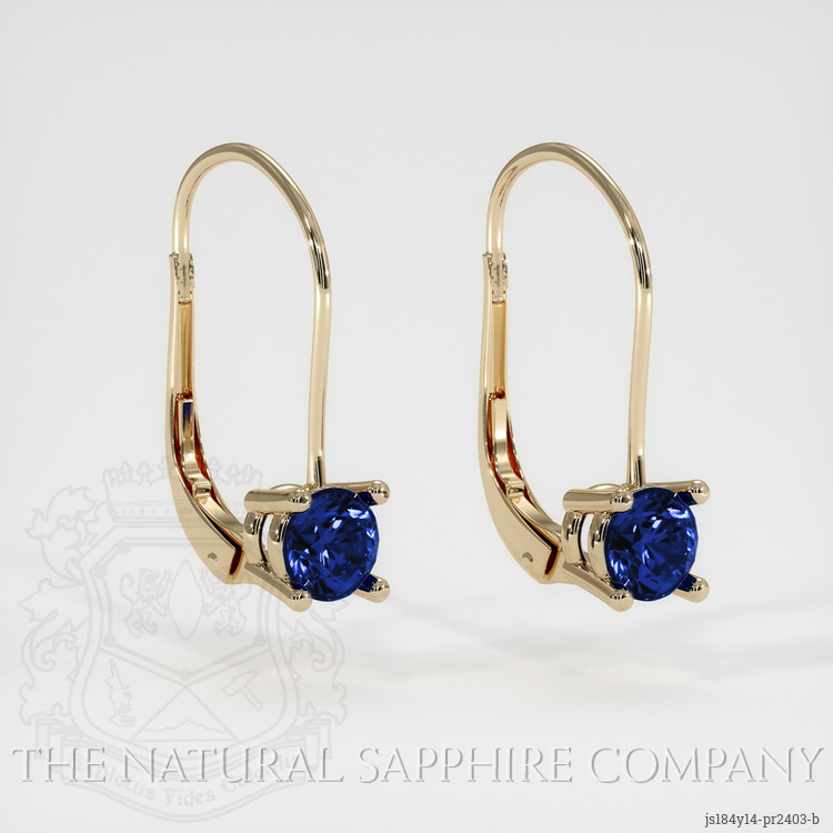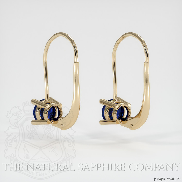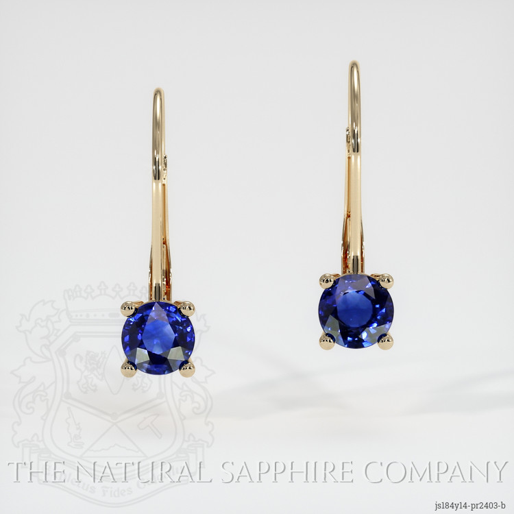The earrings feature a beautiful, transparent pair of sapphires that are 2.18 total carat weight. They are round shape blue sapphires, with the dimensions of 6.00 x 6.00 x 3.36 mm and are mixed brilliant cut, have a clarity grade of eye clean (evaluated at eye level), vivid color saturation, and an excellent polish. The origin of this pair of sapphires is Ceylon (Sri Lanka).