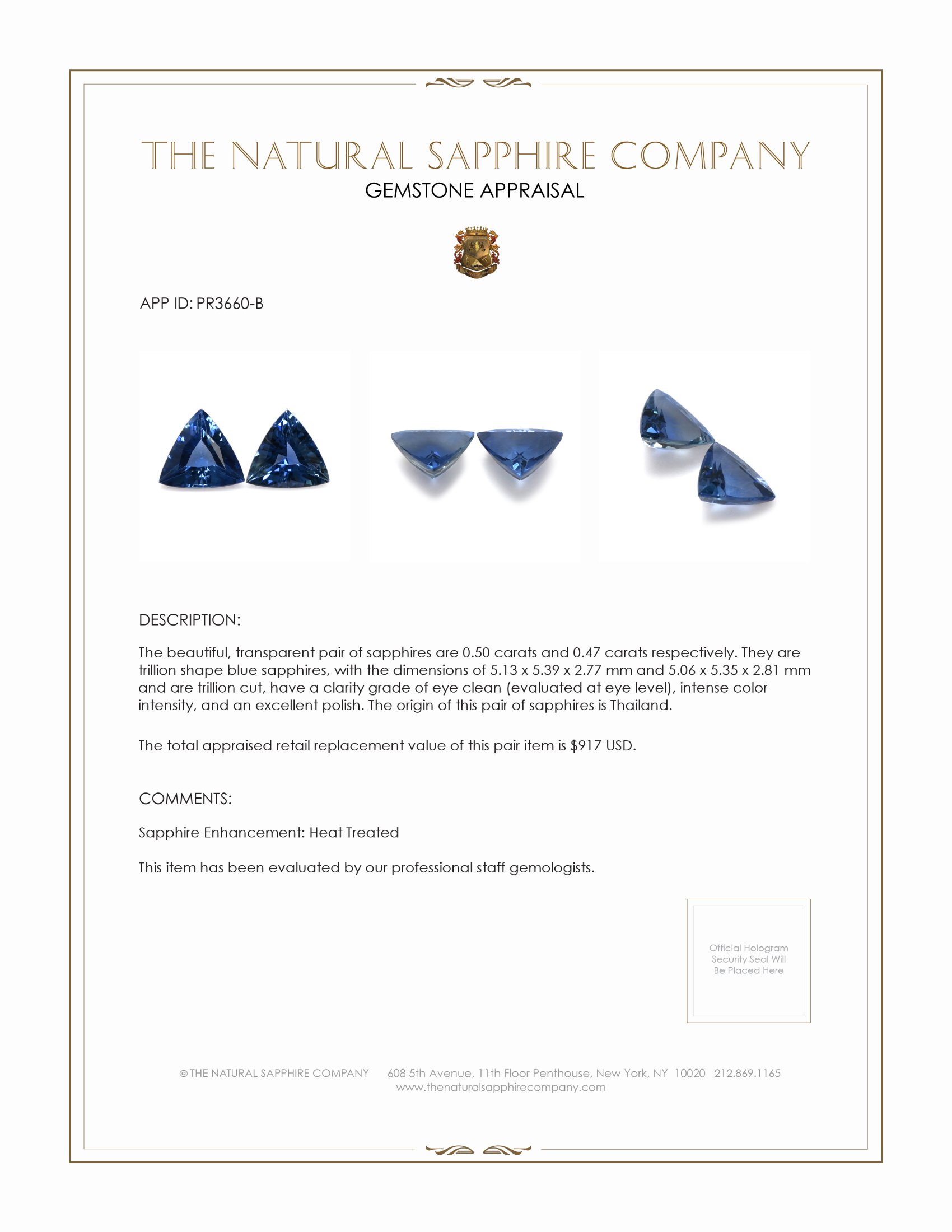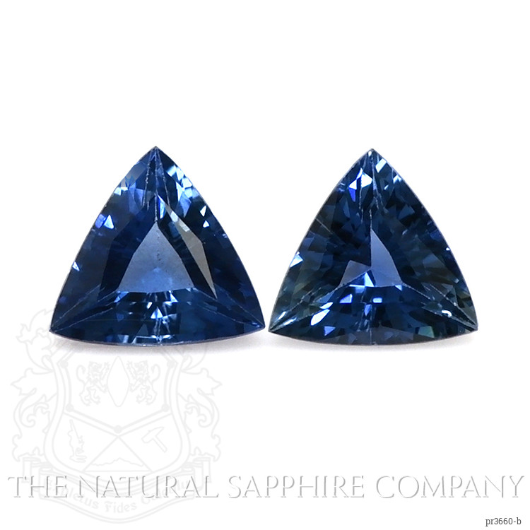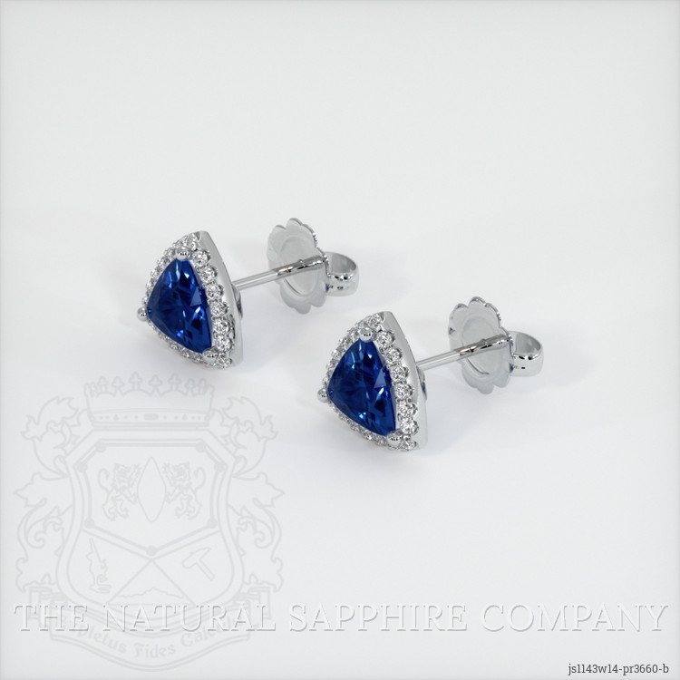 The earrings feature a beautiful, transparent pair of sapphires that are 0.97 total carat weight. They are trillion shape blue sapphires, with the dimensions of 5.13 x 5.39 x 2.77 mm and are trillion cut, have a clarity grade of eye clean (evaluated at eye level), intense color saturation, and an excellent polish. The origin of this pair of sapphires is Thailand.
