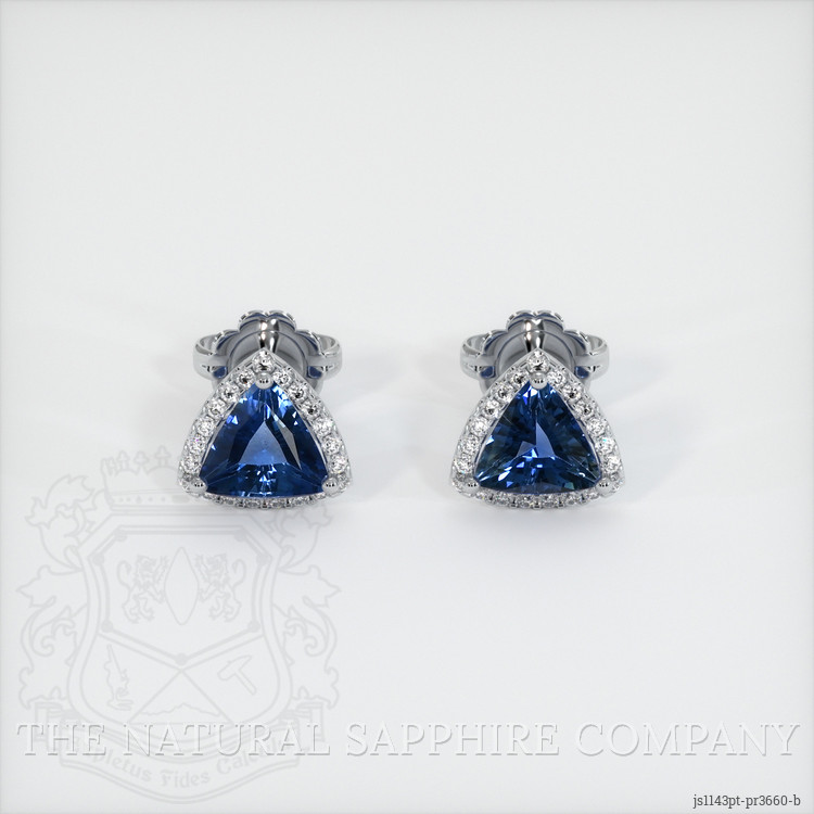The earrings feature a beautiful, transparent pair of sapphires that are 0.97 total carat weight. They are trillion shape blue sapphires, with the dimensions of 5.13 x 5.39 x 2.77 mm and are trillion cut, have a clarity grade of eye clean (evaluated at eye level), intense color saturation, and an excellent polish. The origin of this pair of sapphires is Thailand.