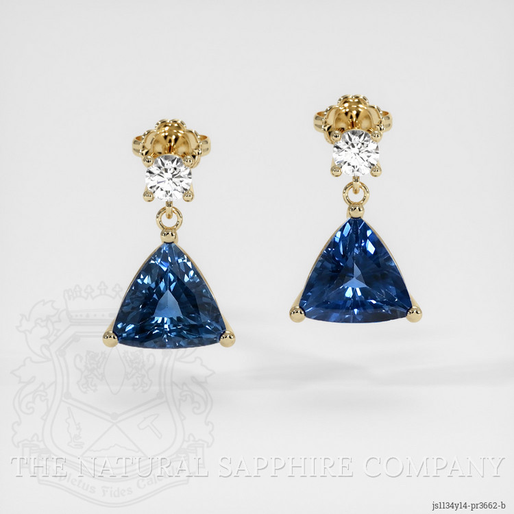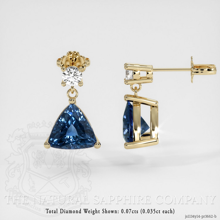 The earrings feature a beautiful, transparent pair of sapphires that are 1.05 total carat weight. They are trillion shape blue sapphires, with the dimensions of 5.07 x 5.44 x 3.07 mm and are trillion cut, have a clarity grade of eye clean (evaluated at eye level), intense color saturation, and an excellent polish. The origin of this pair of sapphires is Thailand.