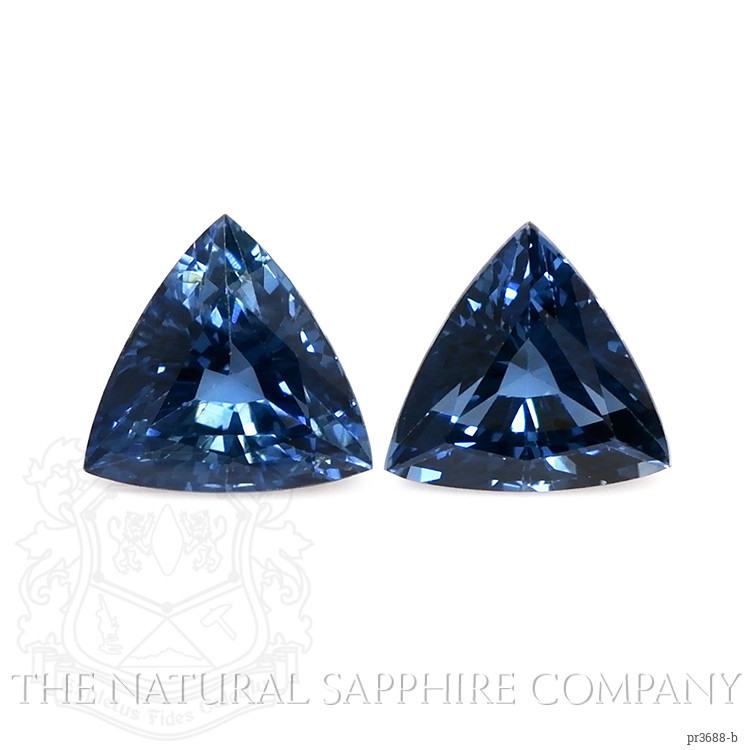 The earrings feature a beautiful, transparent pair of sapphires that are 1.79 total carat weight. They are trillion shape blue sapphires, with the dimensions of 6.01 x 6.27 x 3.66 mm and are mixed brilliant cut, have a clarity grade of eye clean (evaluated at eye level), intense color saturation, and an excellent polish. The origin of this pair of sapphires is Thailand.
