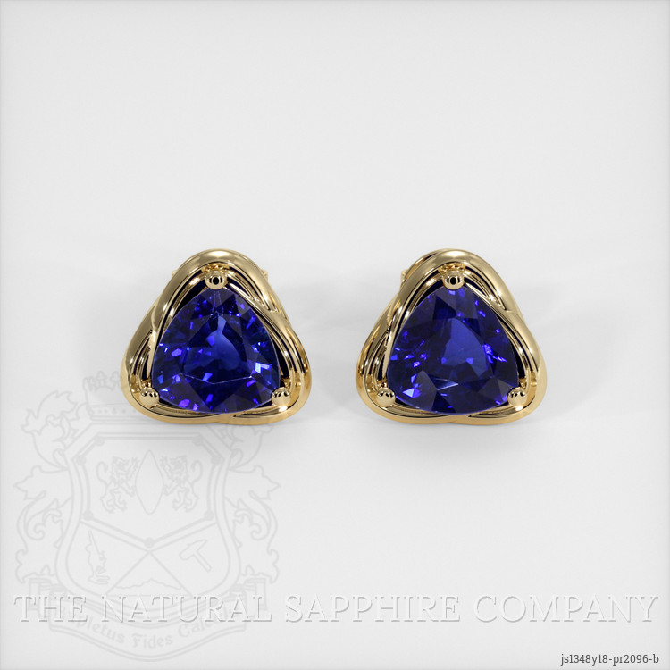 The earrings feature a beautiful, transparent pair of sapphires that are 2.63 total carat weight. They are trillion shape blue sapphires, with the dimensions of 6.80 x 6.80 x 3.69 mm and are trillion cut, have a clarity grade of very slightly included (evaluated at eye level), vivid color saturation, and an excellent polish. The origin of this pair of sapphires is Madagascar.