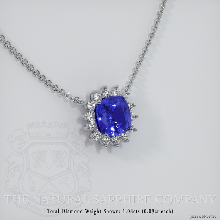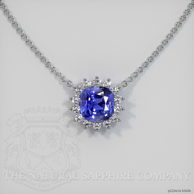 The necklace features a beautiful, transparent 7.24 carat cushion shape blue sapphire with the dimensions of 11.52 x 11.22 x 6.61 mm and a mixed brilliant cut. It has a clarity grade of very slightly included (evaluated at eye level), vivid color saturation, and an excellent polish. The origin of this sapphire is Ceylon(Sri Lanka).