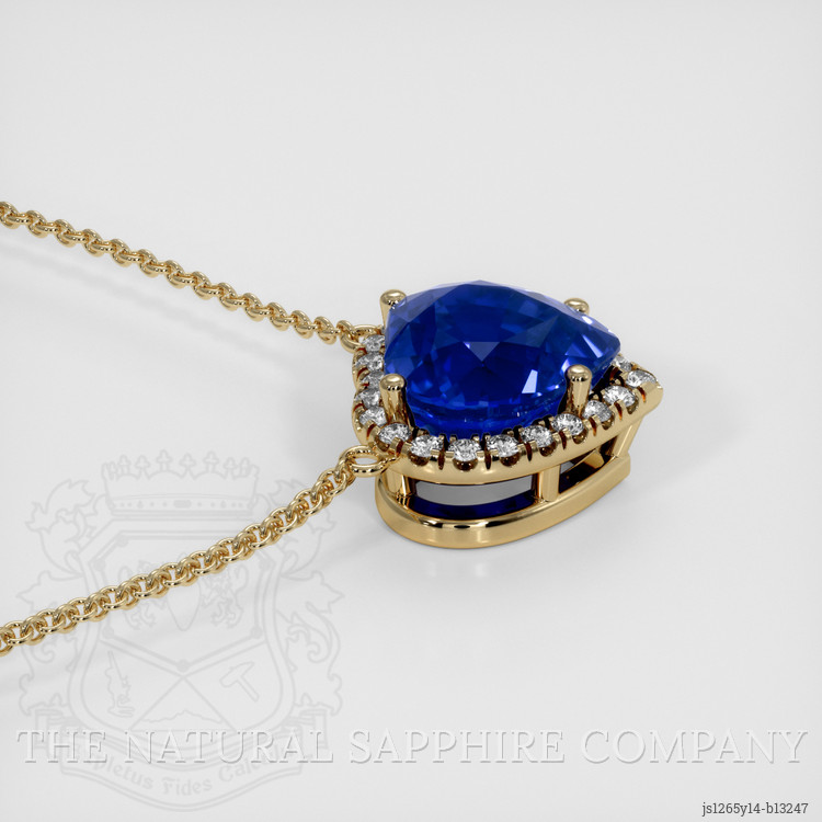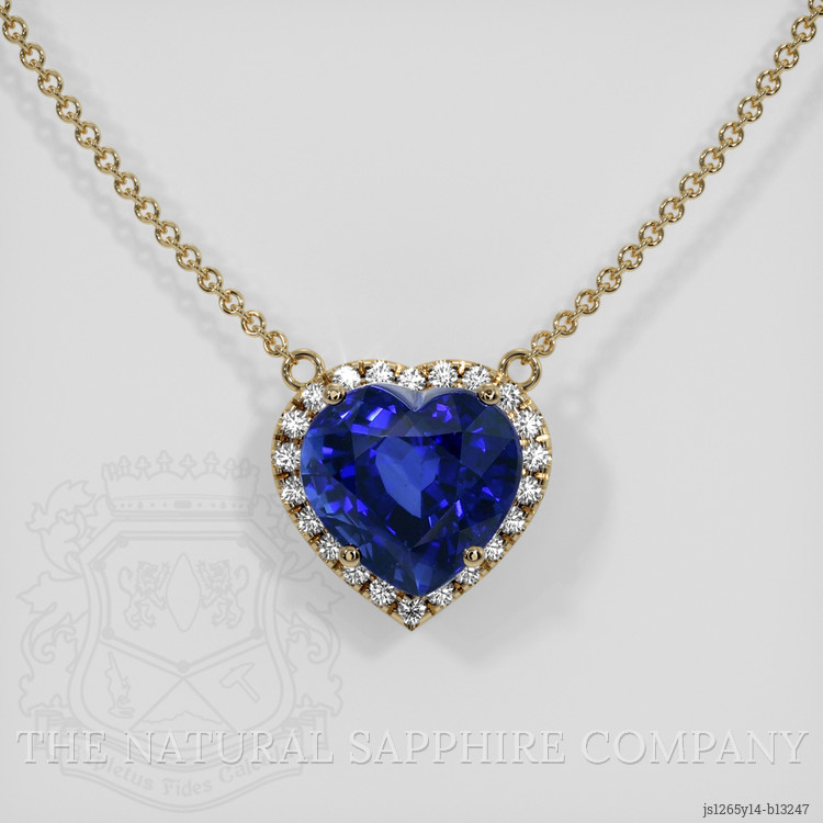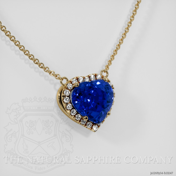 The necklace features a beautiful, transparent GRS certified Vivid Blue “Royal Blue” 4.02 carat heart shape blue sapphire with the dimensions of 8.64 x 9.19 x 6.38 mm and a mixed brilliant cut. It has a clarity grade of eye clean (evaluated at eye level), vivid color saturation, and an excellent polish. The origin of this sapphire is Ceylon (Sri Lanka).