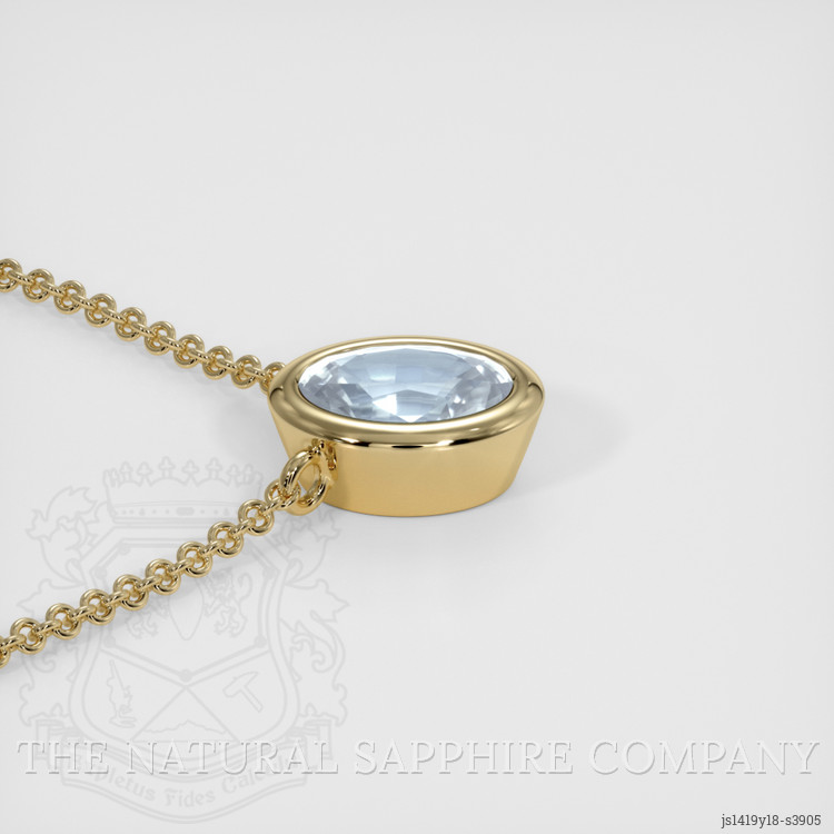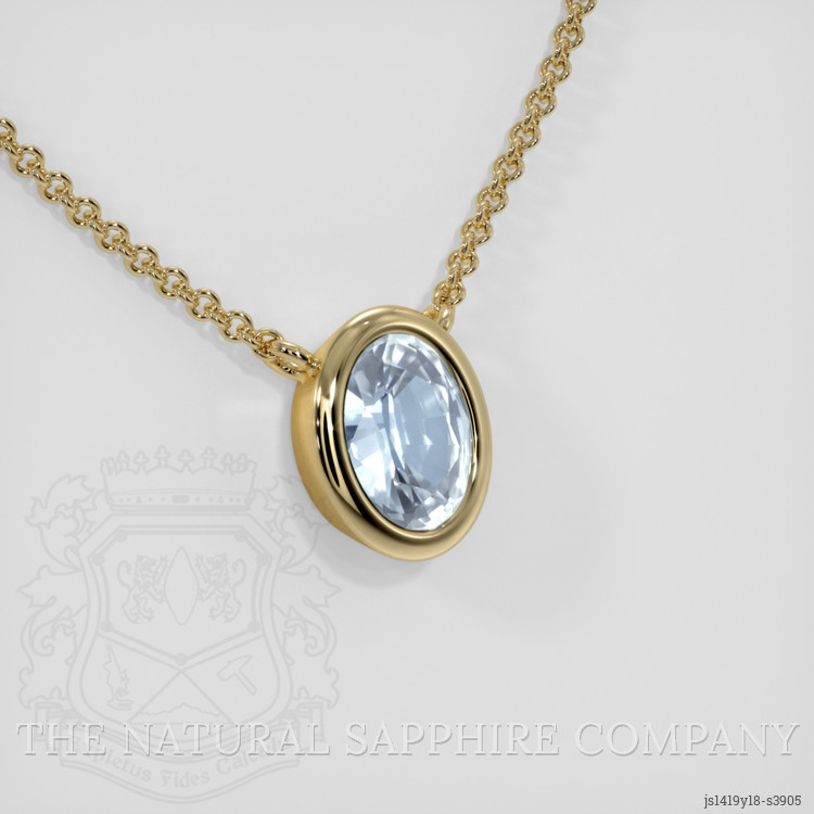 The necklace features a beautiful, transparent 0.49 carat oval shape blue sapphire with the dimensions of 5.72 x 4.27 x 2.55 mm and a mixed brilliant cut. It has a clarity grade of very slightly included (evaluated at eye level), faint color saturation, and an excellent polish. The origin of this sapphire is Ceylon (Sri Lanka).