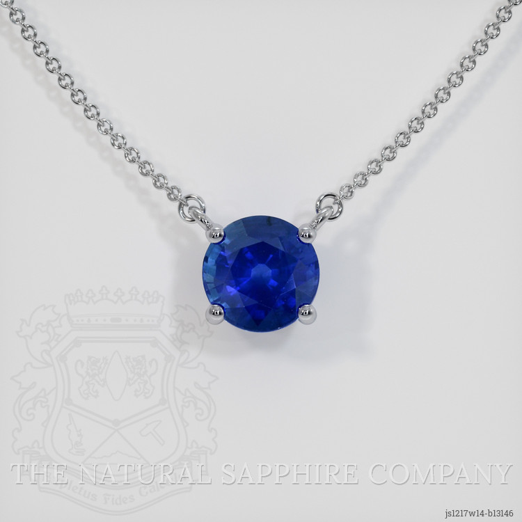 The necklace features a beautiful, transparent 1.74 carat round shape blue sapphire with the dimensions of 6.88 x 6.81 x 4.75 mm and a mixed brilliant cut. It has a clarity grade of very slightly included (evaluated at eye level), vivid color saturation, and an excellent polish. The origin of this sapphire is Ceylon (Sri Lanka).