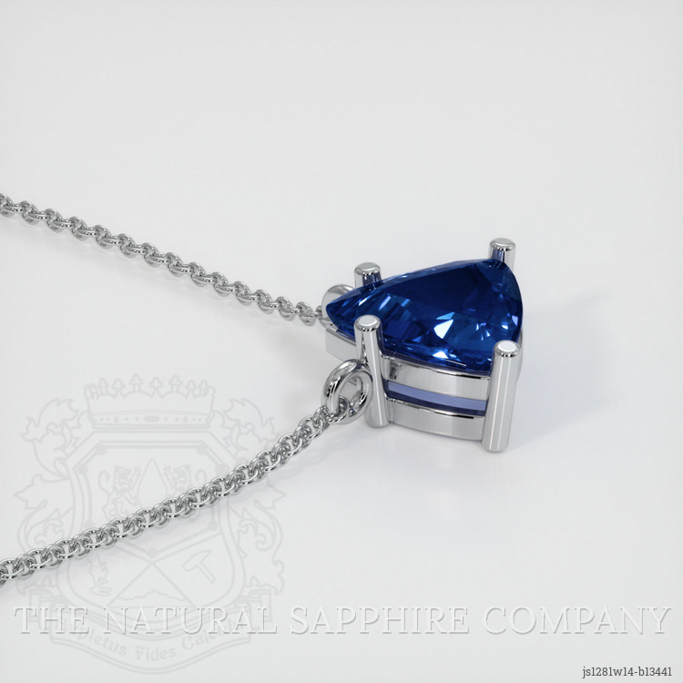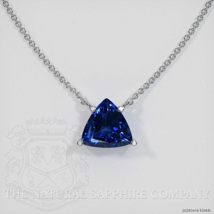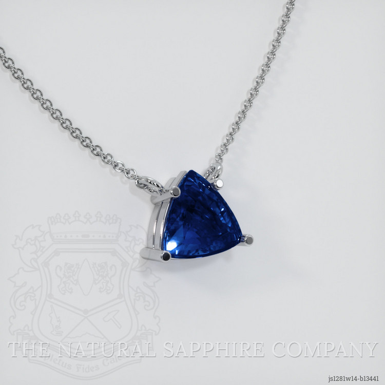 The necklace features a beautiful, transparent 0.87 carat trillion shape blue sapphire with the dimensions of 6.13 x 6.34 x 3.44 mm and a trillion cut. It has a clarity grade of very slightly included (evaluated at eye level), vivid color saturation, and an excellent polish. The origin of this sapphire is Thailand.