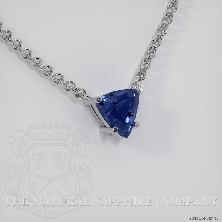 The necklace features a beautiful, transparent 1.31 carat trillion shape blue sapphire with the dimensions of 6.91 x 7.26 x 3.99 mm and a trillion cut. It has a clarity grade of very slightly included (evaluated at eye level), vivid color saturation, and an excellent polish. The origin of this sapphire is Thailand.