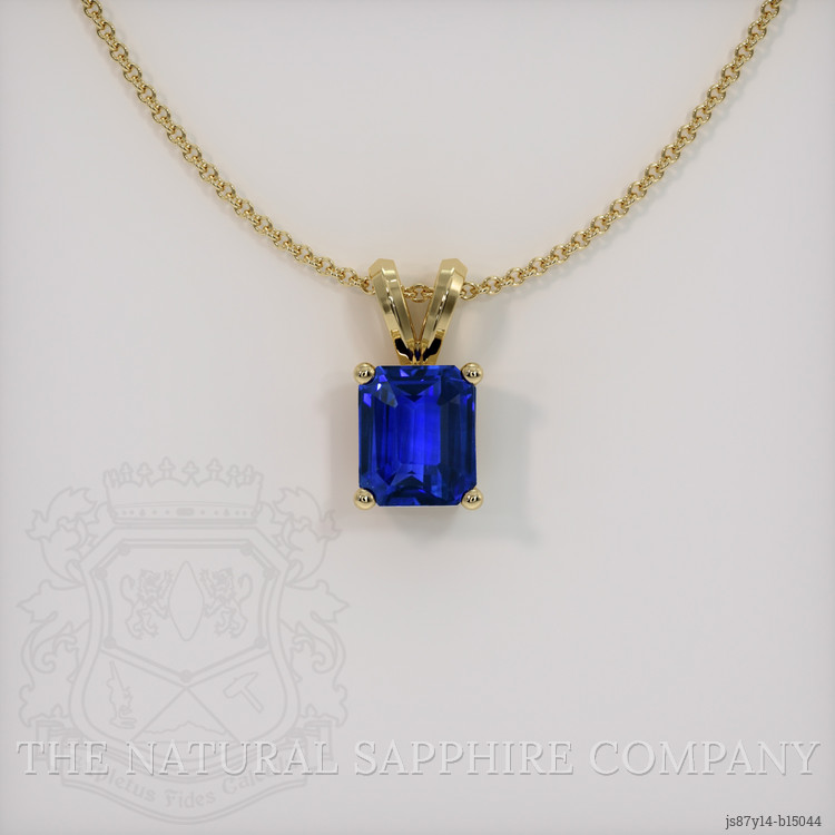 The pendant features a beautiful, transparent 1.01 carat emerald cut shape blue sapphire with the dimensions of 6.05 x 5.04 x 3.17 mm and a emerald cut. It has a clarity grade of eye clean (evaluated at eye level), vivid color saturation, and an excellent polish. The origin of this sapphire is Ceylon (Sri Lanka).