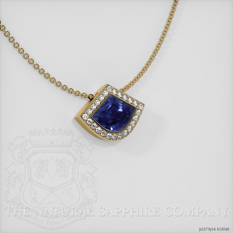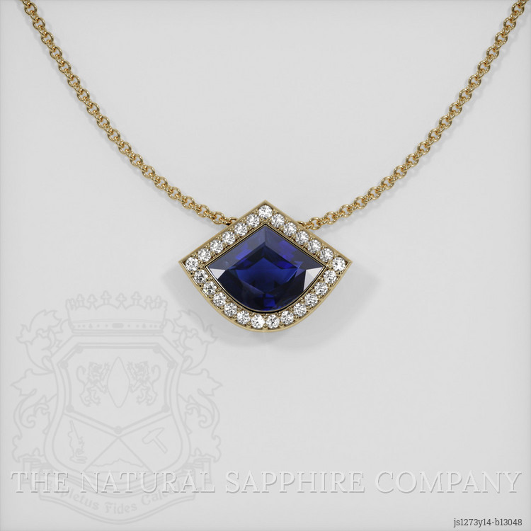 The pendant features a beautiful, transparent 1.70 carat fancy shape blue sapphire with the dimensions of 7.25 x 9.81 x 3.80 mm and a fancy brilliant cut. It has a clarity grade of eye clean (evaluated at eye level), dark color saturation, and an excellent polish. The origin of this sapphire is Ceylon (Sri Lanka).