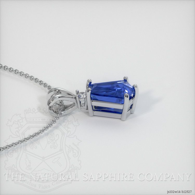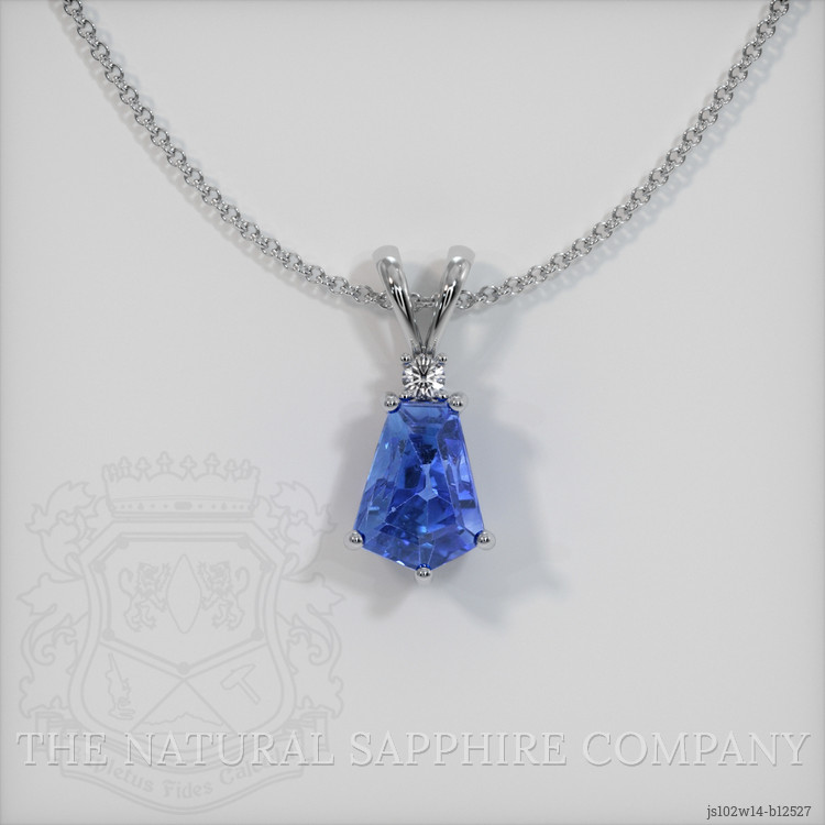 The pendant features a beautiful, transparent 2.54 carat fancy shape blue sapphire with the dimensions of 8.89 x 6.79 x 5.71 mm and a step cut. It has a clarity grade of very slightly included (evaluated at eye level), intense color saturation, and an excellent polish. The origin of this sapphire is Burma (Myanmar).