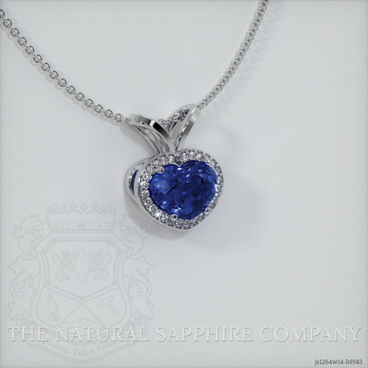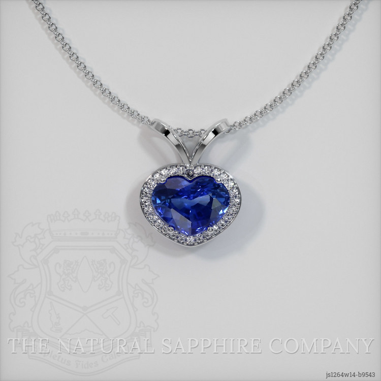 The pendant features a beautiful, transparent AGL certified Blue 2.43 carat heart shape blue sapphire with the dimensions of 6.87 x 9.17 x 5.03 mm and a mixed brilliant cut. It has a clarity grade of eye clean (evaluated at eye level), vivid color saturation, and an excellent polish. The origin of this sapphire is Ceylon (Sri Lanka).