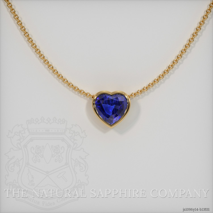 The pendant features a beautiful, transparent 6.00 carat heart shape blue sapphire with the dimensions of 10.59 x 11.38 x 6.36 mm and a mixed brilliant cut. It has a clarity grade of very slightly included (evaluated at eye level), vivid color saturation, and an excellent polish. The origin of this sapphire is Ceylon.
