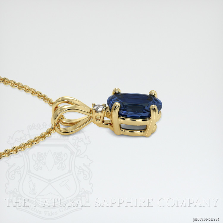 The pendant features a beautiful, transparent GIA certified Blue 0.97 carat oval shape blue sapphire with the dimensions of 6.92 x 4.91 x 3.28 mm and a brilliant cut. It has a clarity grade of very slightly included (evaluated at eye level), intense color saturation, and an excellent polish. The origin of this sapphire is Ceylon (Sri Lanka).