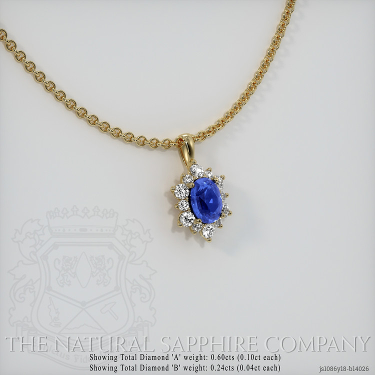 The pendant features a beautiful, transparent 2.47 carat oval shape blue sapphire with the dimensions of 8.98 x 7.02 x 4.61 mm and a mixed brilliant cut. It has a clarity grade of eye clean (evaluated at eye level), intense color saturation, and an excellent polish. The origin of this sapphire is Ceylon (Sri Lanka).