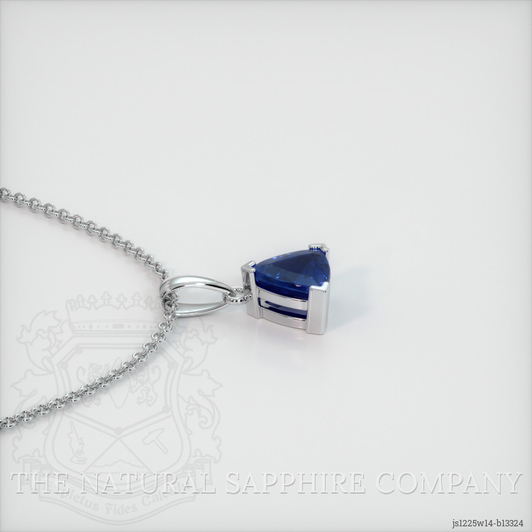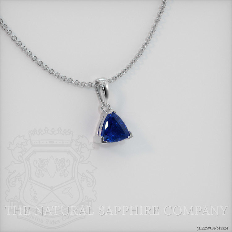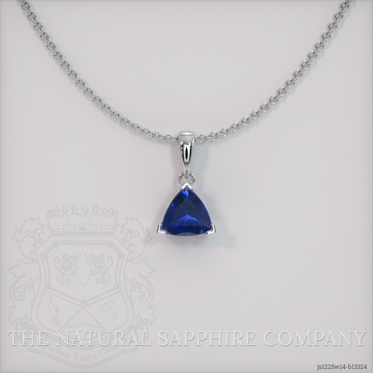 The pendant features a beautiful, transparent 0.72 carat trillion shape blue sapphire with the dimensions of 5.73 x 5.87 x 3.20 mm and a mixed brilliant cut. It has a clarity grade of eye clean (evaluated at eye level), vivid color saturation, and an excellent polish. The origin of this sapphire is Thailand.