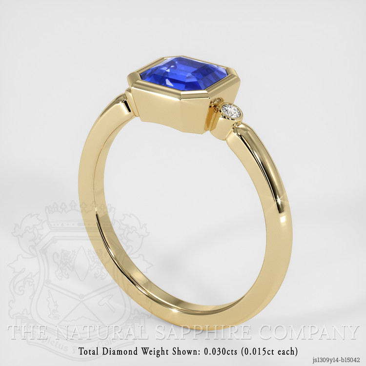 The ring features a beautiful, transparent 1.29 carat asscher - octagon shape blue sapphire with the dimensions of 5.93 x 5.42 x 4.00 mm and a asscher cut. It has a clarity grade of eye clean (evaluated at eye level), intense color saturation, and an excellent polish. The origin of this sapphire is Ceylon (Sri Lanka).