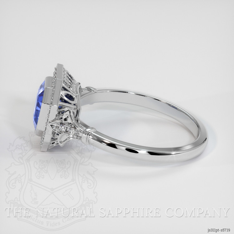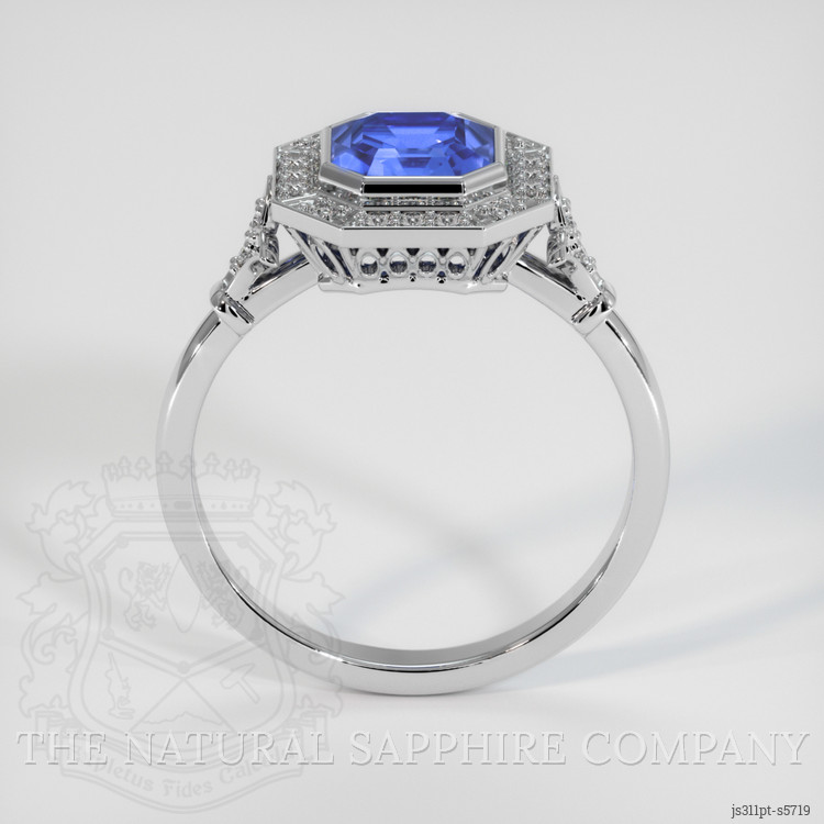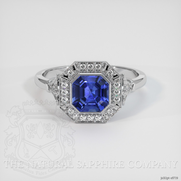 The ring presented by The Natural Sapphire Company is an exquisite fusion of natural inspiration and architectural elegance. At the center lies a 1.37 carat asscher-cut octagon-shaped blue sapphire, notable for its transparency and remarkable dimensions of 6.30 x 6.26 x 3.95 mm. The sapphire, bearing a clarity grade of very slightly included when evaluated at eye level, exhibits a vivid color saturation. The gem's Ceylon origin ensures a deep, mesmerizing hue that echoes the rich blue of the island's serene skies and tranquil waters. Enhanced by an excellent polish, this sapphire radiates a captivating brilliance.